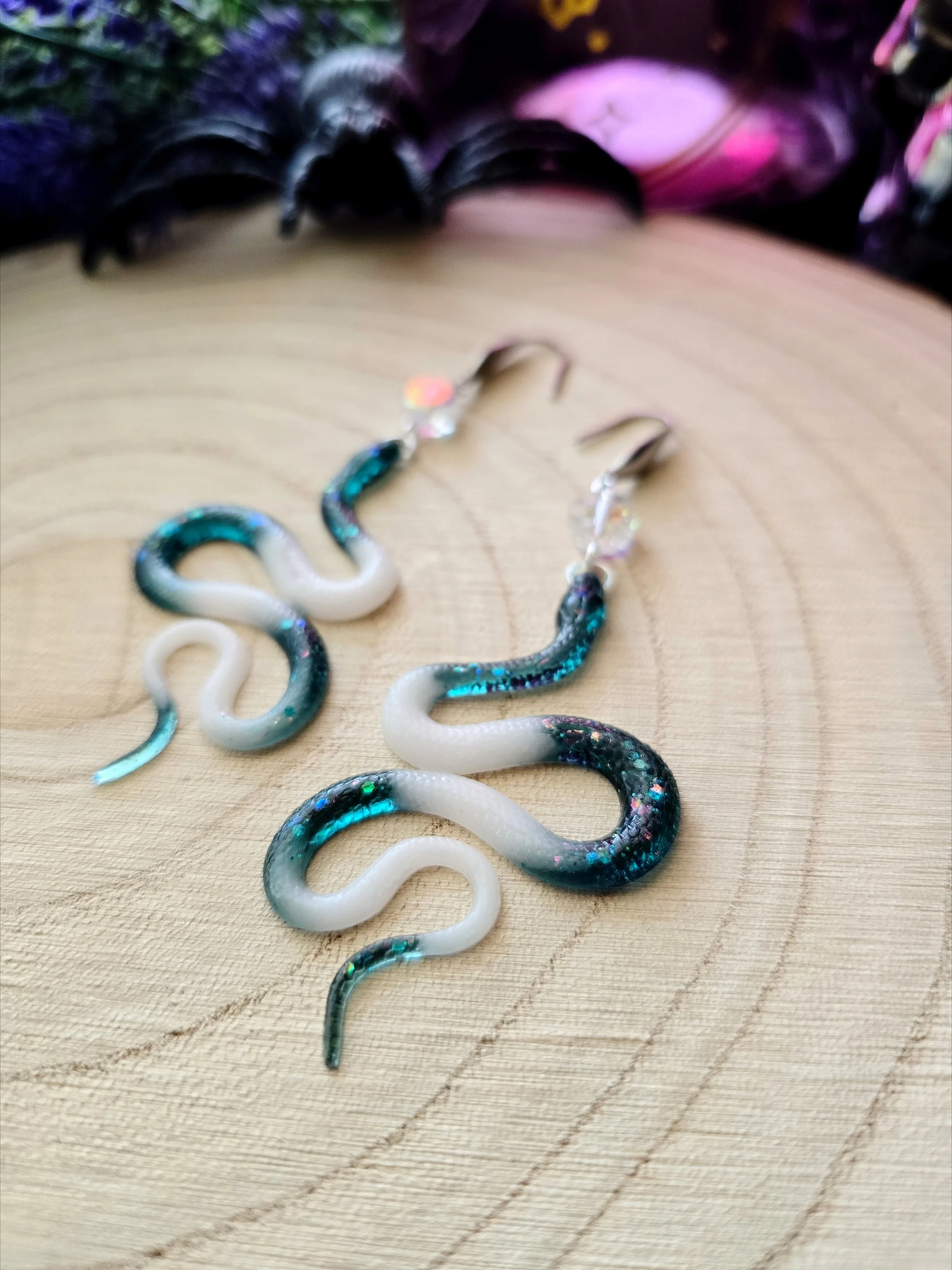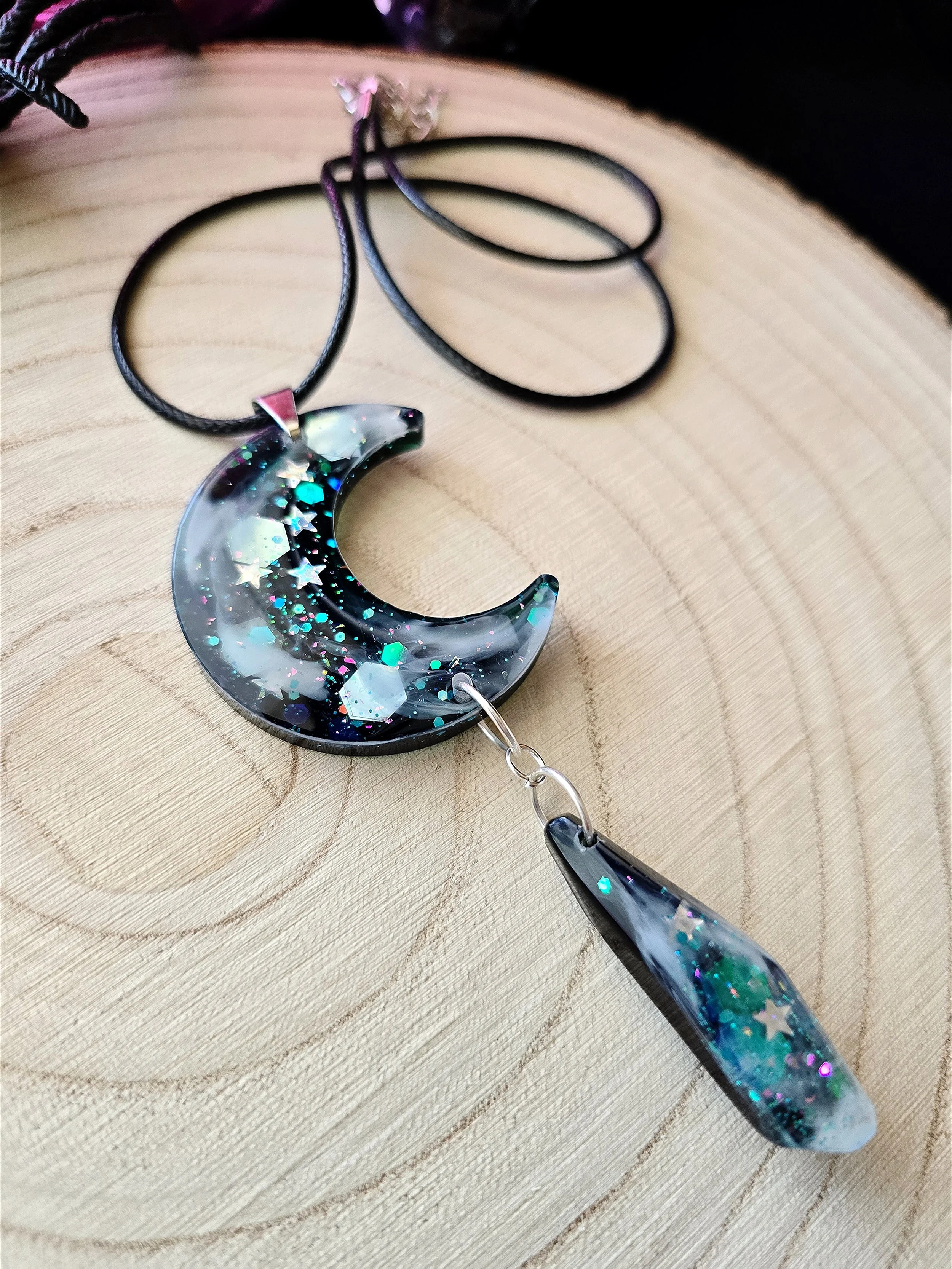 The Umbra Collection lives between dusk and reflection. Crescent moons, faceted gems, and sinuous forms are cast in dark teal resin flecked with aqua stars — jewelry that reads as ritual and as everyday armor. Wear it for intention, or simply because you love the way it moves in the dark.